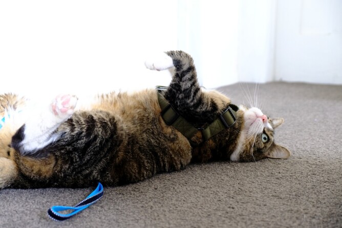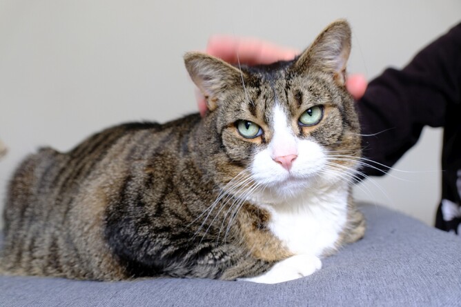 She already had experience with giving cats their medication, but she had to learn how to ‘pill’ him before she could take him home. He has two pills morning and night, and a syrup on his food for potassium. He doesn’t like having whole pills, but “he gets over it pretty quickly”. He’s also on a weight-control diet to get him to a more comfortable size.