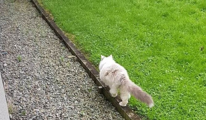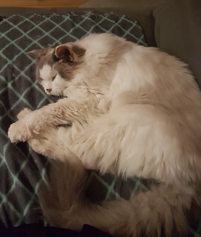 She has her daily supervised walk outside, her own water fountain, heat pump, stimulation brush and a permanent place sitting between Richard and Samantha on the sofa every night, enjoying cuddles.