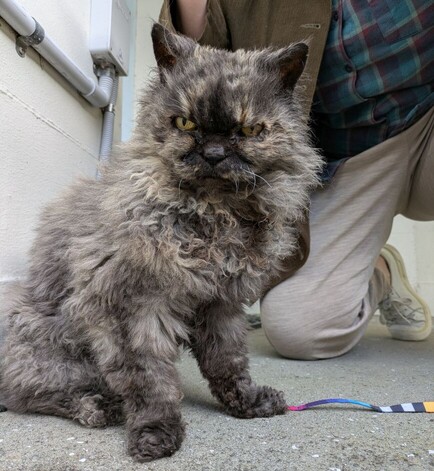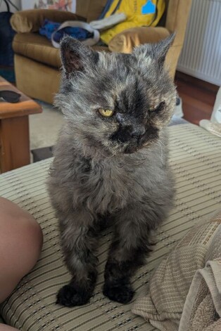 Her fur was matted beyond recognition, and she had an upper respiratory infection affecting her eyes and ears. After having blood tests and half a kilo of fur shaved off at the vets, she settled into the shelter enjoying cuddles and pats.