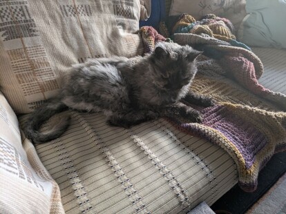 “Rosie sems very happy and still quite active for such an oldie. She is not particularly enticed by some toys but quite interested in chasing string. There's a little octopus on a string that she is quite taken with, but instead of chasing it she just occasionally snuggles up to it and rubs her face on it.