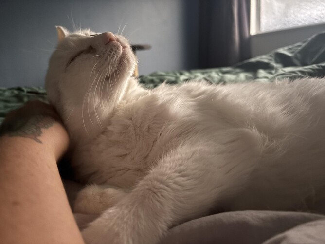 It’s clear that KB is now in her perfect home, where she loves and is loved: “She sleeps next to my head every night, and wakes me up for pats.”