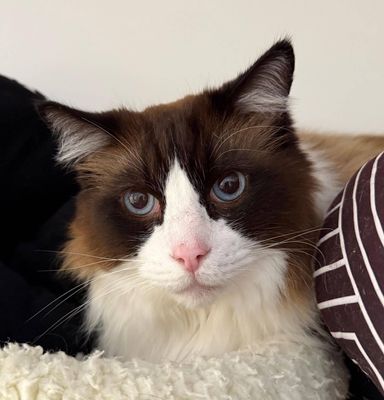 Aslan is a large, blue-eyed Ragdoll boy who loves to hang out in the kitchen with you, especially if you're cooking. Aslan is not a lap cat, but once he trusts you, he is super affectionate and loves to either follow you around or park himself in front of a heater and sleep. He tolerates brushing but isn't the biggest fan. He is quite vocal and loves base of the tail scratches. Aslan is more reliant on his brother for confidence and support, whereas Arlie is quite independent. Being a long-haired cat, he can do the occasional hairball, so he benefits from a supplement like cat malt.