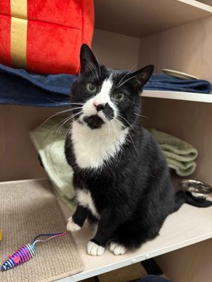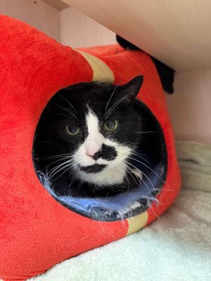 The ideal home for Boshi is one without children and other pets. He is mostly an indoor cat, but enjoys safe garden time or a sunny spot/window to sunbathe and bird-watch. Boshi is currently on a weight loss diet and must remain on one until he is at a more ideal weight for his black and white frame. Despite his being overweight, Boshi can still move at speed and used to be a great hunter of birds.
