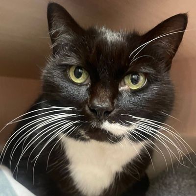 She has never lived with other pets or children, so a nice, quiet home with plenty of company would be an ideal fit for this precious girl. (Who just happens to have quite spectacular thick white whiskers!)