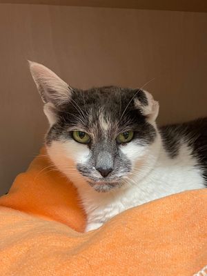 Spotty is a striking grey and white kitty with an Oriental personality. She is quite deaf, so when she has something to say...it's rather loud! For this reason, she must be rehomed to a safe and quiet area. Spotty has been described as an independent but affectionate girl who enjoys being stroked, scratched under the chin, and her belly rubbed when she has warmed to you.