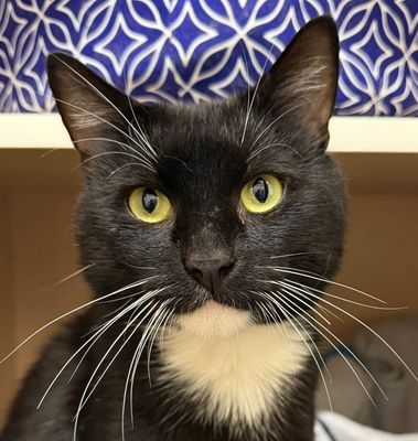 Buster is an extremely handsome black and white kitty. He is FIV+, so must be kept strictly indoors, ideally in a spacious home, as he is still young and full of energy. Buster is chatty and food motivated, so could be a good candidate for harness training - he could join you on hot girl/boy walks! He enjoys playing with wand toys and is affectionate but will tell you when he's had enough with a gentle swipe. He prefers not to be held and would rather sit with you than on you.